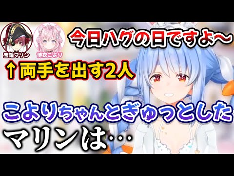 ぺこらを見つけハグの日に抱きつこうとしてきたこよりとマリン船長【兎田ぺこら/宝鐘マリン/博衣こより/雪花ラミィ/ホロライブ/切り抜き】#vtuber #切り抜き